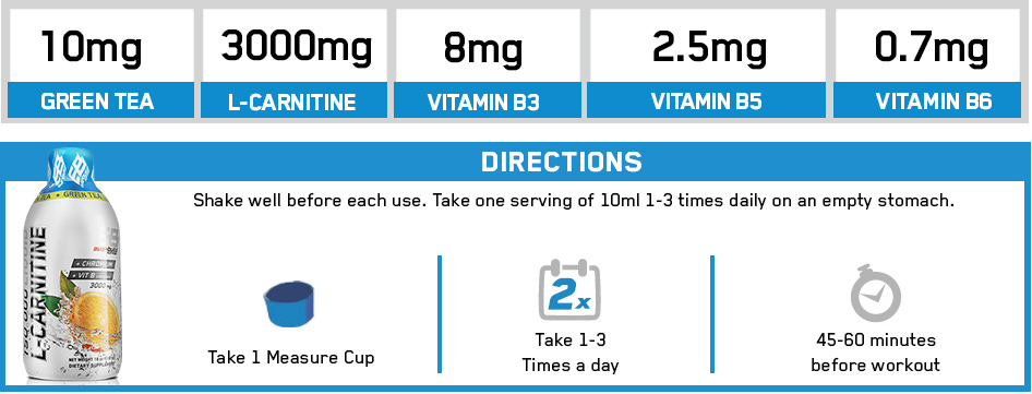 Liquid L-Carnitine 3000 mg + Green Tea is a liquid solution combining one of the most effective active ingredients for fat loss – l-carnitine, chromium picolinate, green tea extract, and B-complex vitamins. What makes this Everbuild product stand out from the other liquid carnitine formulas is mainly the concentration of L-carnitine – whole 3 000 milligrams per single dose of 10 ml.