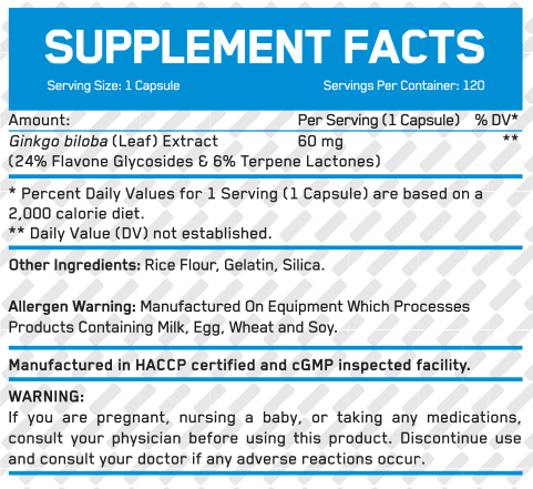 Food supplement containing 100% natural extract of Ginkgo Biloba, which improves brain function and stimulates memory. Its powerful health benefits positively affect focus and mood, while also being used for mild forms of depression and panic disorder.