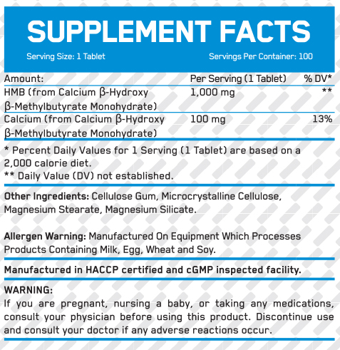 Ingredients: Calcium (from Calcium B-Hydroxy B-Methylbutyrate Monohydrate), HMB (Calcium B-Hydroxy B-Methylbutyrate Monohydrate)