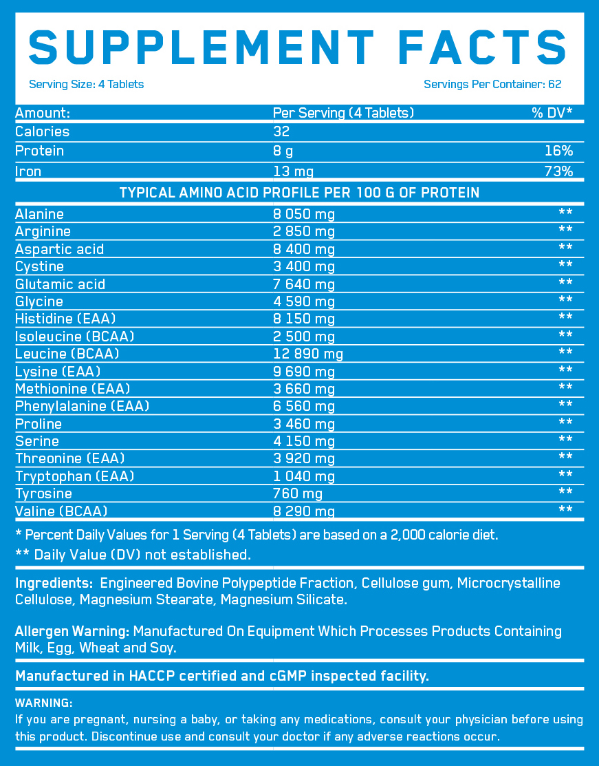 Suggested use: Take 4 tablets before and 4 tablets after training. Additionally, you can add 4 tablets before sleep. In a resting day take 4 tablets in the morning and 4 tablets before sleep.