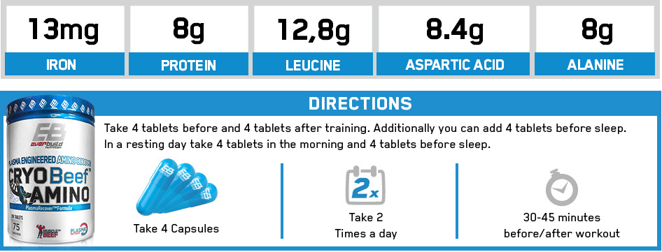 Cryo Beef Amino is a product of the evolution of the food supplement industry. They are unique and can be considered as a breakthrough in sport science. Everbuild Nutrition is a pioneer and first in the world to present a complex amino acids product derived from beef erythrocytes refined from iron. The formula has a unique high bioavailable rating, which is caused mainly because of the high Leucine and other BCAA and essential amino acid content. Cryo Beef Amino shouldn't be easily mistaken with the lower class amino acids derived from beef meat and waste products.
