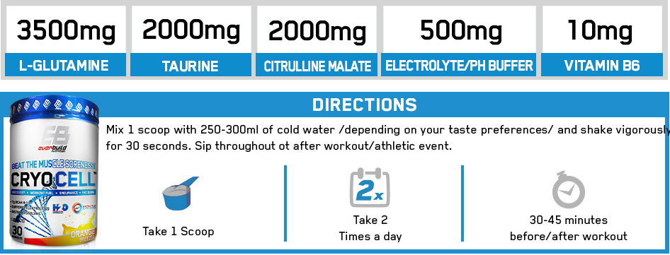 CryoCell is a synergistic composition formula, which holds the most vital active ingredients responsible for the recovery, endurance, and energy in the human body. The main substances in the complex are the ultra-micronized, water-soluble 8:1:1 Branched-Chained Amino Acids. They are reinforced with additional amino acids. The main purpose of the supplement is to be anti-catabolic with sparing and keeping the muscle properties. It is also enriched with electrolytes vital for optimal hydration in the body.