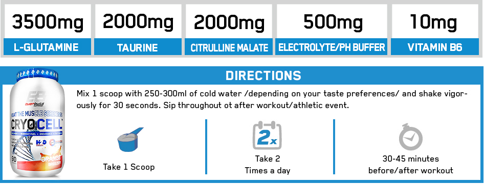CryoCell is a synergistic composition formula, which holds the most vital active ingredients responsible for the recovery, endurance, and energy in the human body. The main substances in the complex are the ultra-micronized, water-soluble 8:1:1 Branched-Chained Amino Acids. They are reinforced with additional amino acids. The main purpose of the supplement is to be anti-catabolic with sparing and keeping the muscle properties. It is also enriched with electrolytes vital for optimal hydration in the body.
