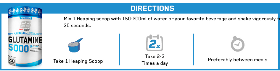 Everbuild Glutamine 5000 contains 100% pure L-glutamine of pharmaceutical quality. The L-glutamine itself is the most commonly met amino acid in the human body. Up to 60% of the amino acids in their pure form are made up of glutamine. Around 20% of the amino acids in the blood, meanwhile, are also made up of glutamine.