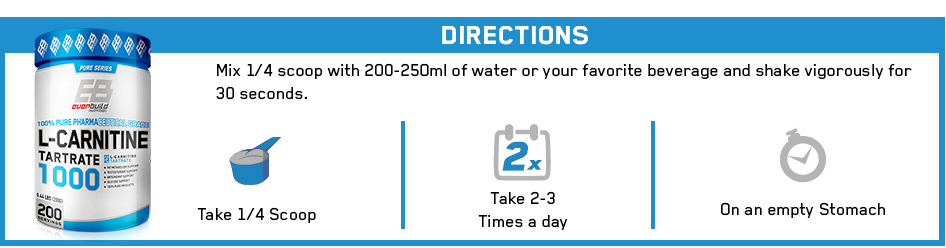 You have probably already heard about L-carnitine at this point, just like everybody else. It is a popular amino acid which takes part in numerous body functions. As a supplement, it is known for its body fat burning qualities. This can be attributed to the main function of the L-carnitine in Everbuild L-Carnitine Tartrate 1000 which is to transport fatty acids to the mitochondria within the muscle cells. They are then used as an energy source. What is peculiar in this case is that even the waste material from this reaction is thrown away. This is what makes Everbuild L-Carnitine Tartrate 1000 such an indispensable and desired product.