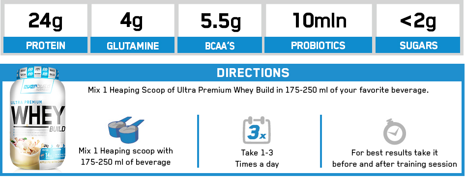 Everbuild Ultra Premium Whey Build accelerates the recovery process, encourages muscle gain and increases the daily protein intake simultaneously. This innovative protein powder is loaded with 4 grams ‘smart’ carbohydrates per dose. Their mission is to accelerate the transport of proteins in the organism so they can reach the desired destination in the shortest period of time possible.
