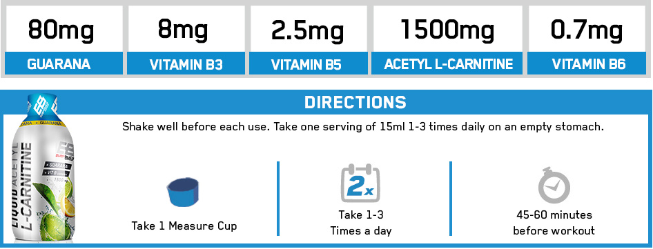 Liquid Acetyl L-Carnitine + Guarana is a highly bioavailable and effective supplement for reducing the excess body fat. The liquid formula is a combination of acetyl l-carnitine and plant extract from guarana seeds. Synergistic ingredients are added not only to increase the fat loss but also for promoting energy and endurance.
