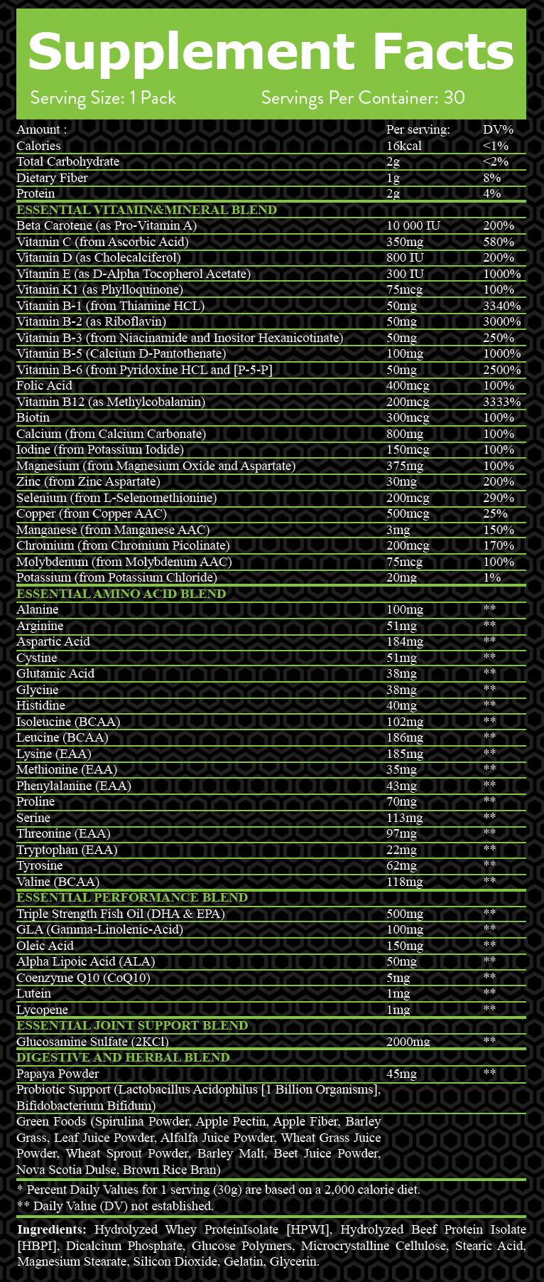 Features 65 premium nutrients, phytonutrients, aminos&herbs